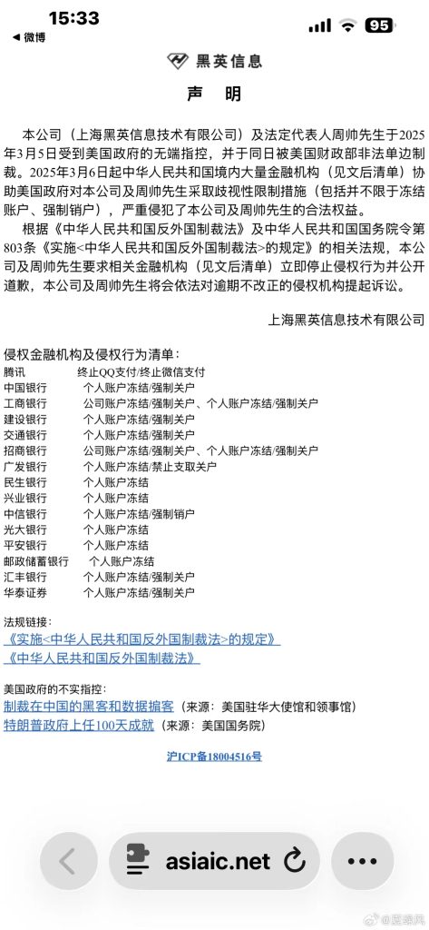 一位被美国制裁的黑客上海黑英信息技术有限公司周帅分享了自身经历:曾以为身处国内、无海外资产便不受美制裁影响,直到遭遇美国财政部 OFAC 经济制裁 —— 借助 SWIFT 系统影响力,国内多家金融机构、企业随之限制其服务,日常生活与资金往来陷入不便,即便我国《反外国制裁法》实施,相关机构仍未调整,其经历也打破了 “国内无影响” 的认知。
