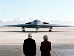 抽象创意一对老年夫妇观看B-2轰炸机2提示词:35 毫米胶片摄影,从后方全景拍摄一位身着黑色长大衣的老年男性与一位身着深红色长大衣的老年女性,二人对称站立在广阔的混凝土停机坪上。他们正注视着停在中景处的一架诺斯罗普・格鲁曼 B-2 “幽灵” 隐形轰炸机。远景是淡蓝色天空下朦胧的雪山。画面上三分之一被巨大机库的内部天花板及水平横梁构成框架。电影感正式构图,低饱和度色调,可见胶片颗粒感,氛围肃穆而厚...赞 (0)mmxhy2025-11-22阅读(5)