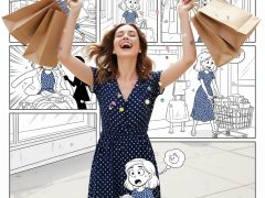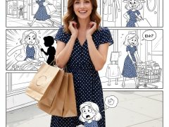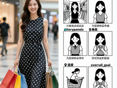 3提示词:“标题”:“购物版”,“描述”:{“real_woman”: {“外貌”:“一位穿着时尚波点裙的真实人类女性”“姿势”:“脸上带着开心的表情提着购物袋”,“风格”:“全写实摄影”,“细节”:“鲜艳的色彩,清晰的细节,逼真的皮肤质感,自然光。”“限制”:“必须保持照片级写实,不能卡通化”},“background_comic”: {“风格”:“精细的多...