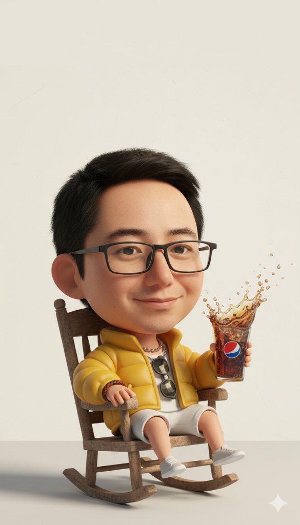 Pose: sitting casually on a wooden rocking chair, lifting a glass of Pepsi cola, with a dynamic splash effect frozen mid-air, capturing a lively and cinematic moment.
