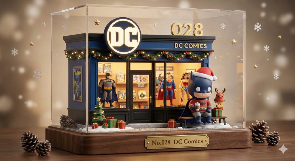 店内温暖金色照明,玻璃橱窗和玻璃门,橱窗内展示微缩[品牌核心产品1、产品2、产品3][节日特别版产品]。