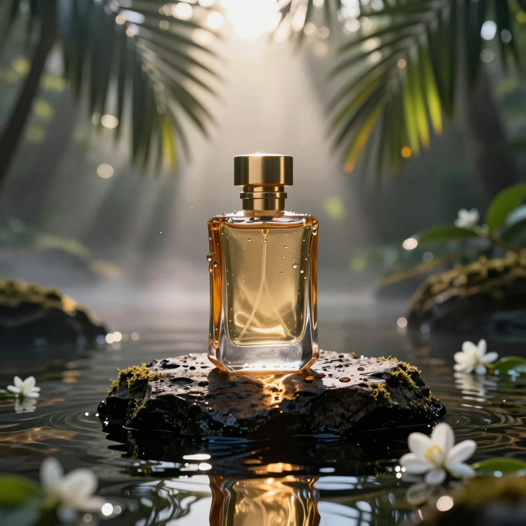 主体是一个半透明的琥珀色玻璃香水瓶,配有拉丝金金属瓶盖,优雅地坐落在从平静水面浮出的一块粗糙纹理的深色板岩上。
