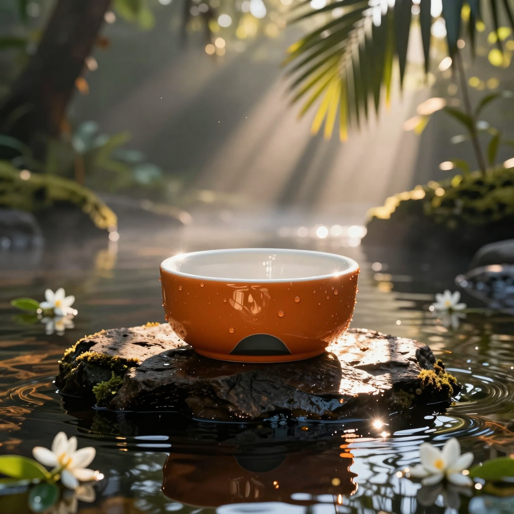 细节与材质:极致的微距特写焦点。瓶身表面可见冷凝水珠,反射着周围的绿植。板岩的纹理极其细致,带有苔藓斑块。水面有轻微的涟漪,具有逼真的反射和折射效果。背景中漂浮着失焦的微粒和精致的白色茉莉花,漂流在水面上 。