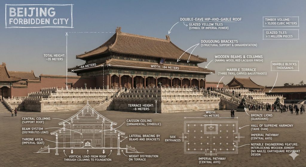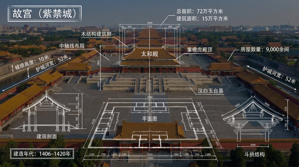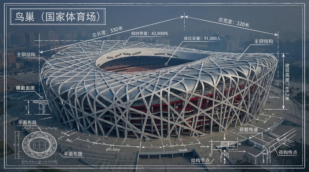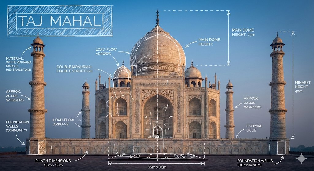 提示词:“请制作一张[地标]的信息图,将地标的真实照片与蓝图风格的技术注释和图表叠加在图像上。在角落的手绘框中注明标题“[地标]”。添加白色粉笔风格的草图,展示关键结构数据、重要尺寸、材料用量、内部结构图、荷载流向箭头、横截面图、平面图以及显著的建筑或工程特征。风格:蓝图美学,照片上叠加白色线条图,技术/建筑注释风格,具有教育信息图的感觉,注释后方可见真实环境。”