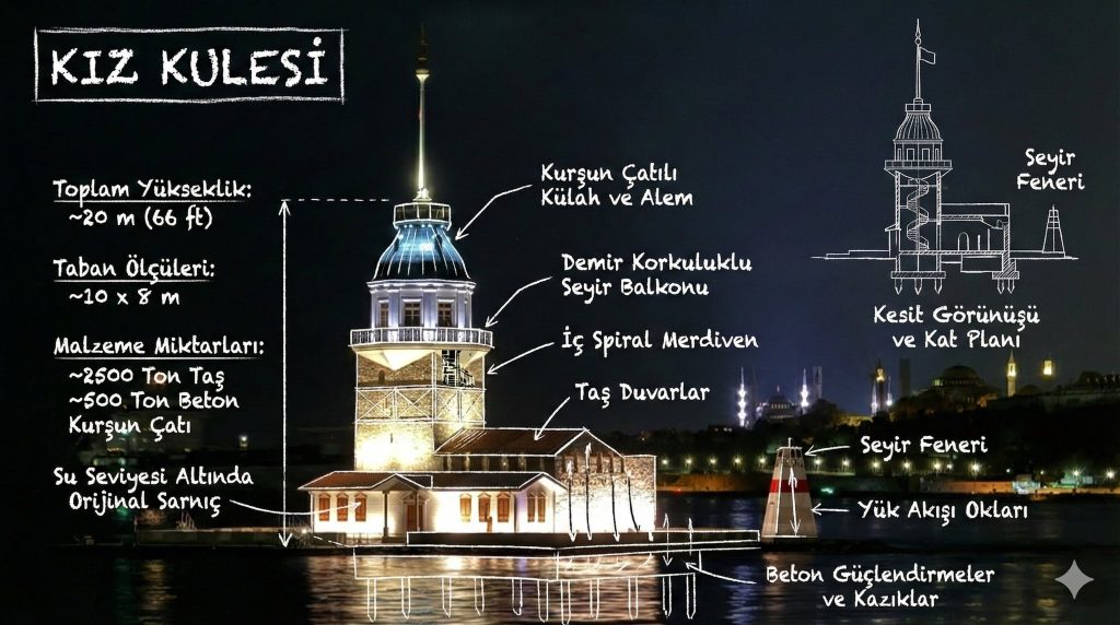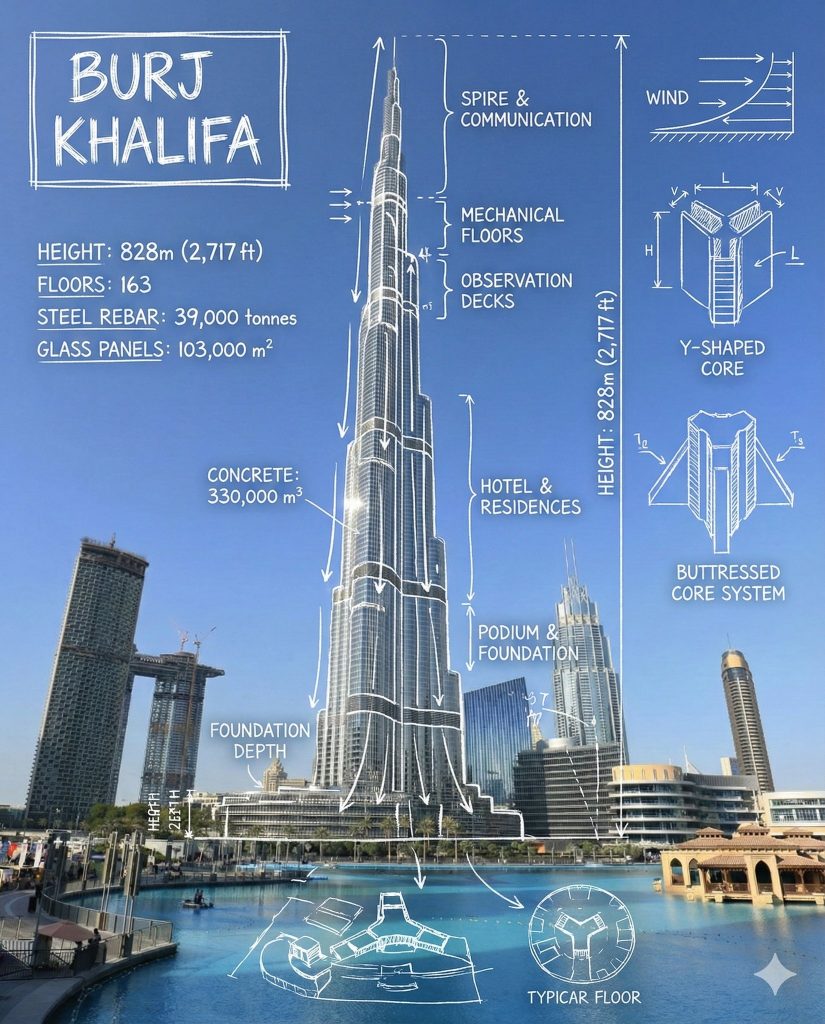 prompt:“Create an infographic image of [LANDMARK], combining a real photograph of the landmark with blueprint-style technical annotations and diagrams overlaid on the image. Include the title “[LANDMARK]” in a hand-drawn box in the corner. Add white chalk-style sketches showing key structural data, important measurements, material quantities, internal diagrams, load-flow arrows, cross-sections, floor plans, and notable architectural or engineering features. Style: blueprint aesthetic with white line drawings on the photograph, technical/architectural annotation style, educational infographic feel, with the real environment visible behind the annotations”
