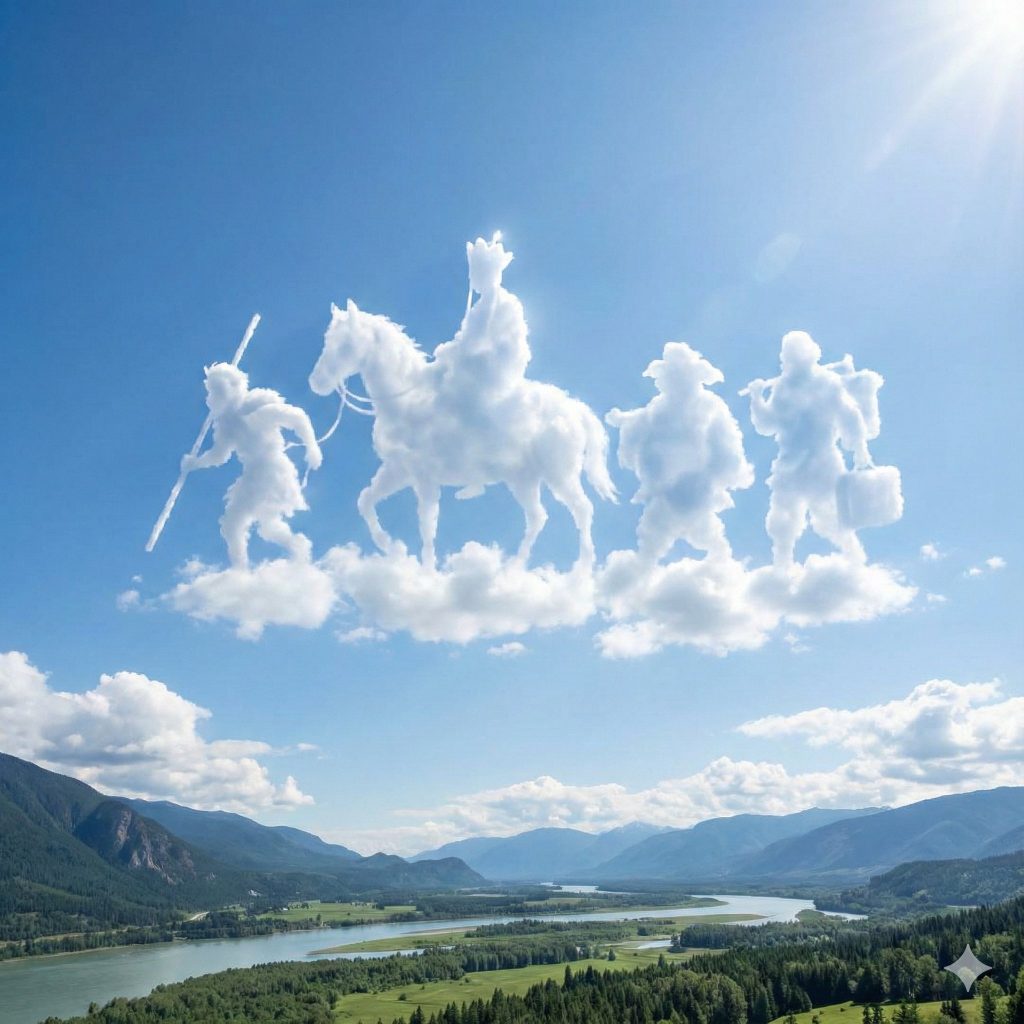 创建一个超写实的天空场景,柔和、自然的云层有机地聚合,形成一个清晰可辨的【主体】轮廓。云朵形态高悬在明亮蔚蓝的天空中,自然漂浮,其下方是清晰可识别的【景观描述】景观,为画面提供稳固的视觉基础。