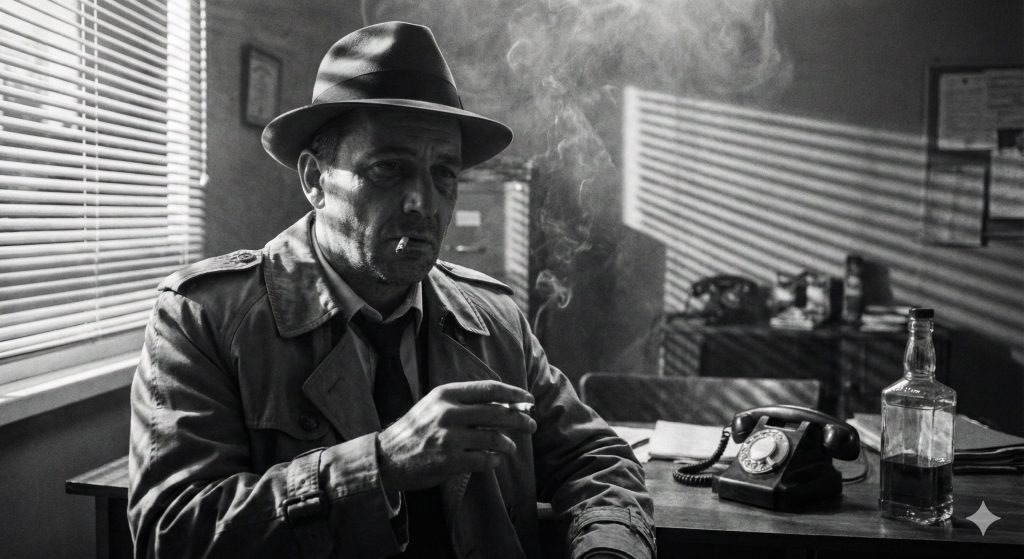 “lighting”: [ “sliced light from blinds”, “deep shadows” ],