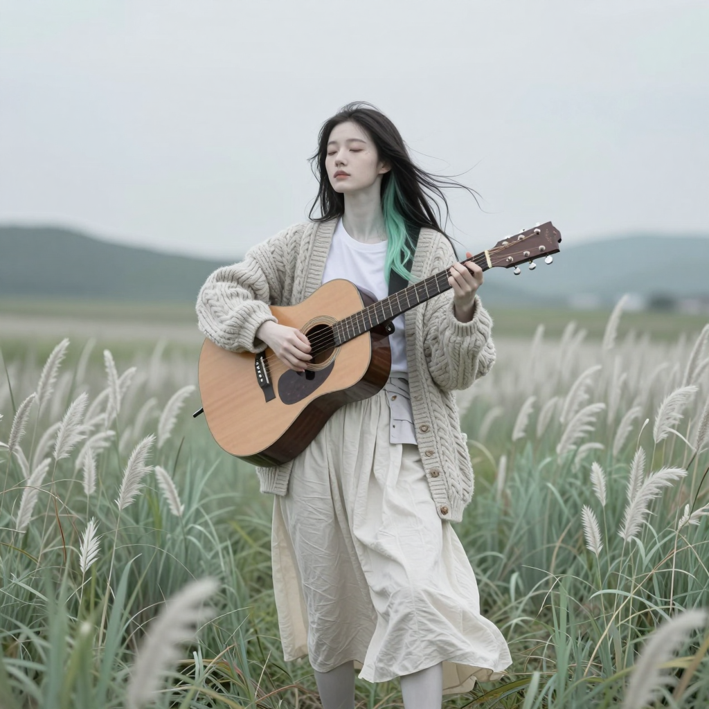 An ethereal, ultra-detailed full-body portrait of a beautiful young Asian woman (use reference uploaded photo), standing in a dramatic, emotionally intense posture in a vast open meadow. She is captured mid-powerful strum on a natural light-wood acoustic dreadnought guitar, torso slightly twisted, head subtly tilted back, eyes softly closed, channeling deep contemplation and intense melancholy. Attire & Details: extremely pale porcelain-white skin with cool undertone; oversized, heavily textured chunky cable-knit cardigan in heathered oatmeal; simple white T-shirt layered over a mismatched-patch button-up shirt; flowing high-waisted linen skirt in pure ecru/light ivory; long dark windswept hair with a hidden cool-mint-green streak at the tips. Setting & Composition: towering chest-height wispy meadow grasses (ilalang), dense and mint-green dominant with pale sage and pure-white seed heads; soft blurred hills in background; vertical 9:16 framing with large empty negative space in pale overcast sky. Aesthetics: high-key diffused daylight, minimal contrast, shallow DoF with creamy natural bokeh; neutral flat color profile emphasizing cool mint and pale tones; cinematic portraiture, cottagecore folk style, ultra-high texture resolution, 8k, volumetric light, subtle cinematic grain.