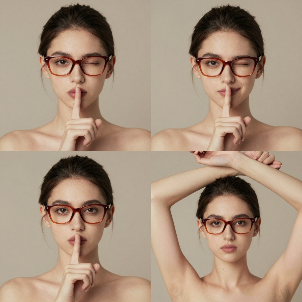 The image is divided into a two-by-two grid, creating four distinct portrait shots. Top-Left: Subject faces the camera slightly, with a neutral, thoughtful, or subtly seductive expression, and winks with her left eye. Top-Right: Subject is looking directly at the camera with a subtle smile, winking with her right eye, while bringing her right index finger up to her mouth in a “shushing” gesture. Bottom-Left: Subject is looking directly at the camera with a more serious or intense expression, with her right index finger held over her lips, another “shushing” gesture. Bottom-Right: Subject is looking directly at the camera with a neutral expression, raising both arms over her head with her hands lightly clasped or touching, possibly indicating a stretch or relaxed pose.