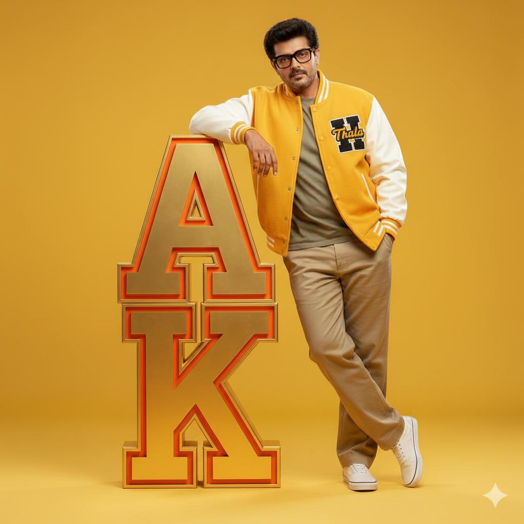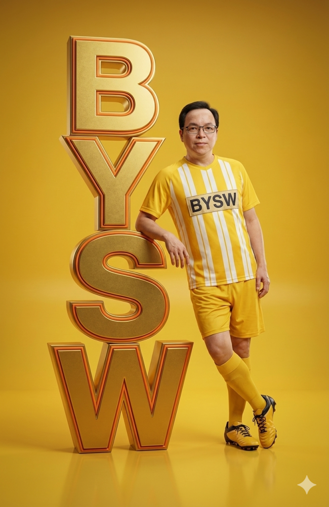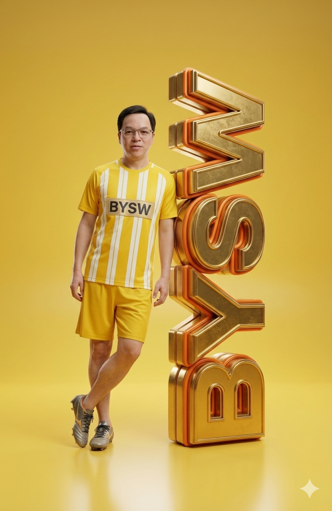 这是一张男士全身超写实影棚肖像(见图)。他戴着眼镜,身穿黄色棒球夹克,夹克边缘饰有白色条纹,并缝有醒目的“BYSW”字样布贴;内搭灰色T恤;下身穿着米色卡其色宽松裤和白色Vans运动鞋。他姿态放松自信,优雅地倚靠在一个巨大的3D棒球风格字母“BYSW”旁。字母“BYSW”呈金色,两侧饰有橙色滚边,垂直放置在光滑的黄色地板上。